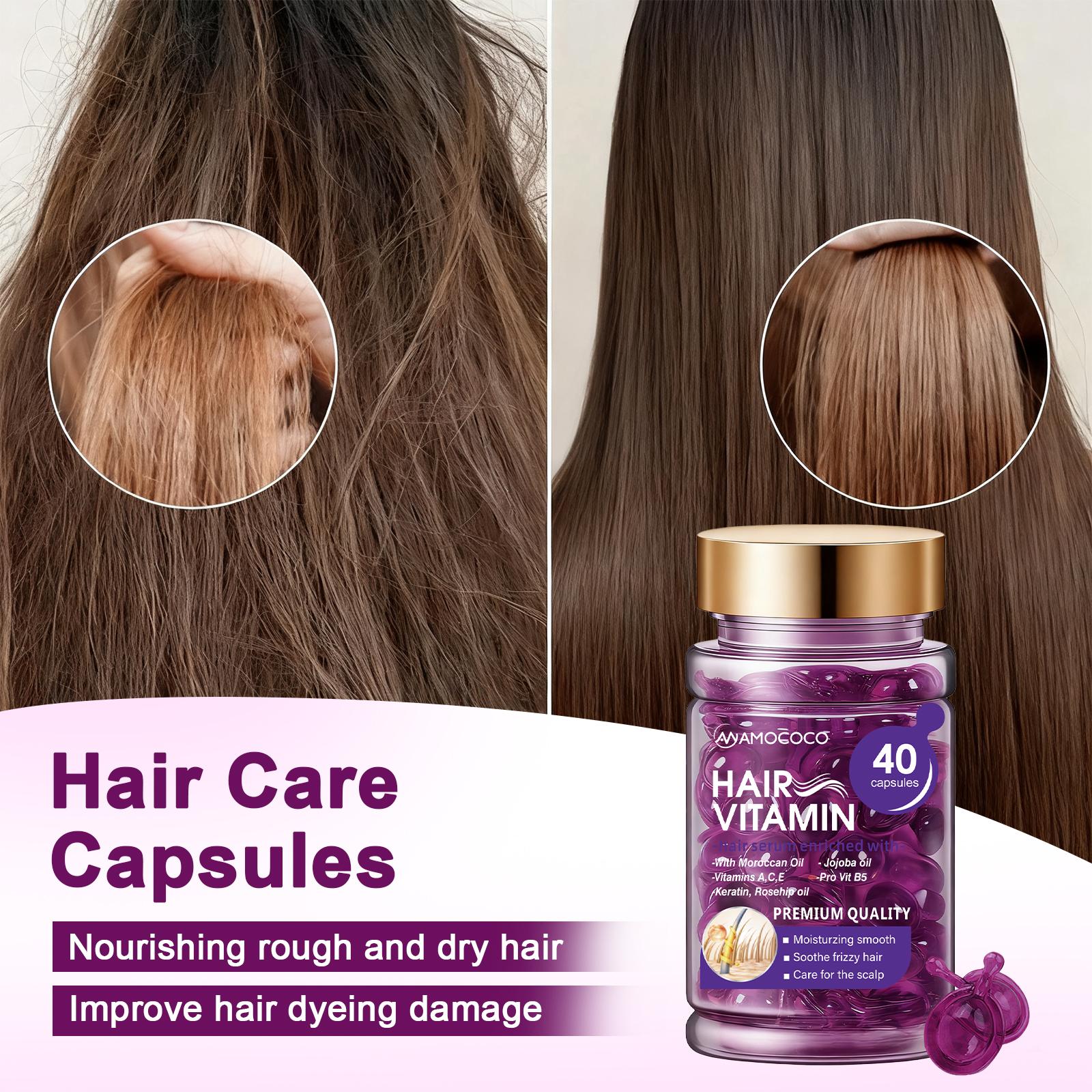 These Hair Vitamin Capsules are specially formulated for color-treated and permed hair. They smooth frizz, restoring silkiness and shine. Each pack contains 40 capsules, ensuring you have ample supply for your hair care routine.
